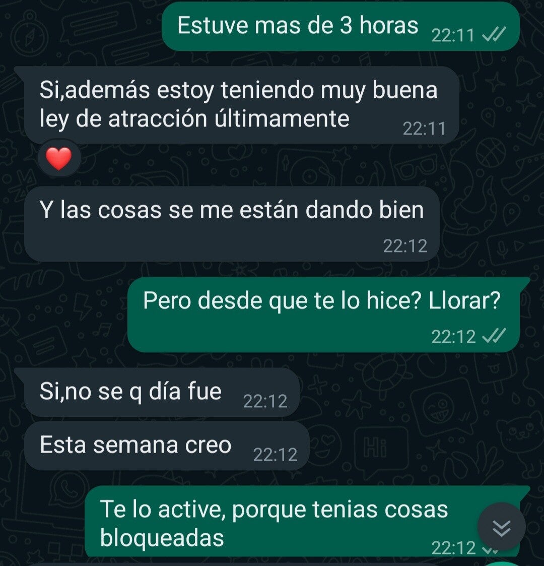 "Amor!! Muchas gracias!!! Ayer pensé en tí, fuí al gimnasio y tenia una fuerza pero liviandad, y buena disposición; cómo que me costó mucho menos que antes...me soprendió la facilidad con la que pude hacer todos los ejercicios que normalmente me cuesta muchíssimo".